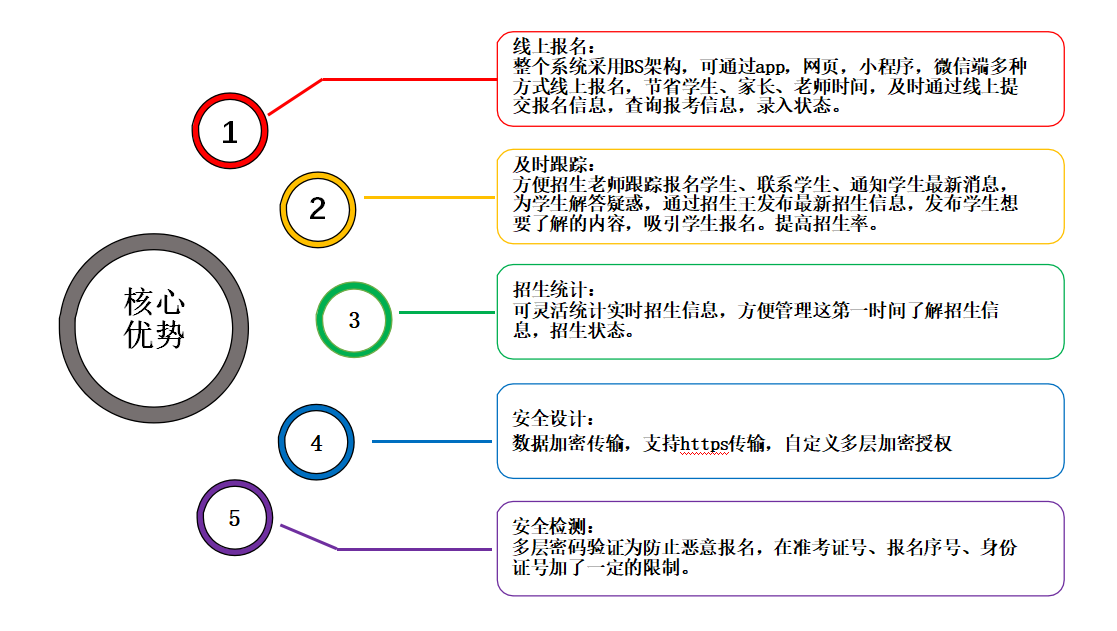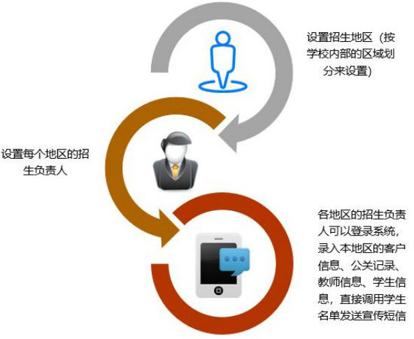智慧校園招生管理系統(tǒng)針對招生部門,整合系統(tǒng)涵蓋了整個校園招生流程, 招生計劃制定、招生計劃安排、招生宣傳部署、錄取信息采集、公關記錄、學生信息、錄取管理以及畢業(yè)證書的打印、郵寄等一體化的招生信息化管理。通過招生系統(tǒng)使得學校獲得更多的學生生源,通過招生系統(tǒng)讓學生快速的接觸學校,架起一座通通往學校的一座橋梁。 二、系統(tǒng)架構(一)招生地區(qū)設置:可設置招生地區(qū)根據(jù)學校內部按照區(qū)域劃分設置,并且可給這個地區(qū)設置招生負責人,招生負責人可登錄系統(tǒng)錄取當?shù)氐目蛻粜畔ⅲP信息,招生學生信息。 ![]()
