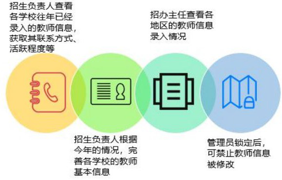 招生負責人可查看各學校往年已經錄入的教師信息,獲取其聯(lián)系方式方便錄取溝通,各招生負責人可根據(jù)今年的招生情況,完善各學校老師的信息,招生辦可查看各個地區(qū)錄入招生教師的詳情。 ![]()