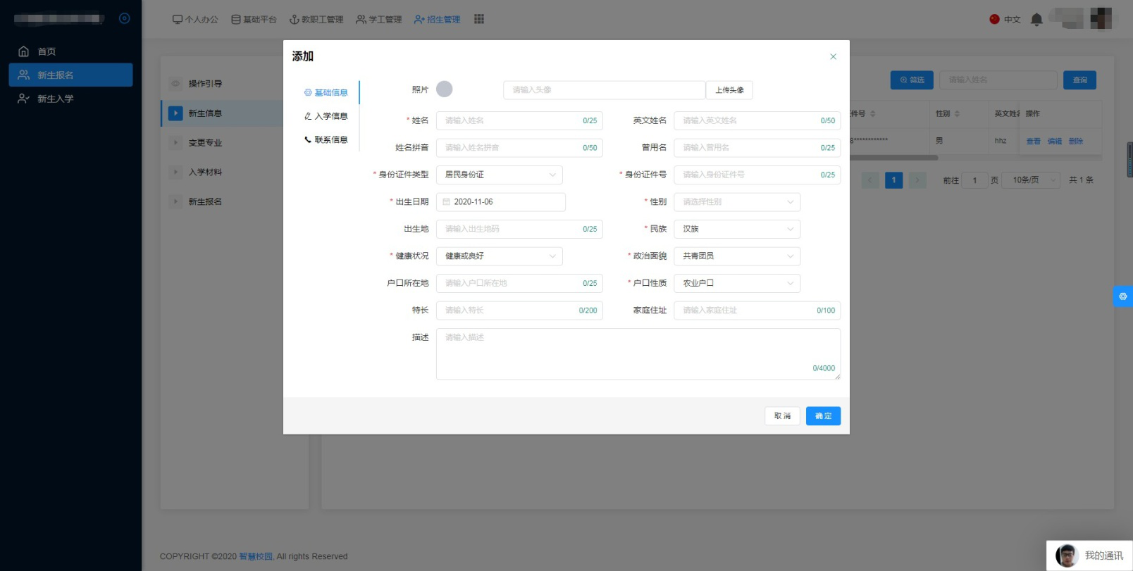 錄取的學生,統(tǒng)一由學校打印錄取通知書,通過郵寄的方式發(fā)放到錄取學生手中??纱蛴′浫⊥ㄖ獣?。 ![]() 三、系統(tǒng)功能(一)輸入功能該系統(tǒng)提供了對招生人信息錄入、單位信息錄入、新生報名信息錄入、新生注冊信息錄入等的模式錄入和表格界面錄入。在出現(xiàn)從表信息錄入時會出現(xiàn)輔助錄入,操作方便快捷,可大大提高您的工作小效率。