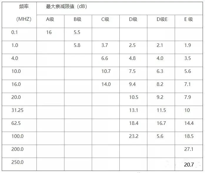 A、六類屏蔽模塊的按照T568B標(biāo)準(zhǔn)壓接:橙白、橙、綠白、藍(lán)、藍(lán)白、綠、棕白、棕六類屏蔽線的檢測,綜合布線系統(tǒng)鏈路傳輸?shù)淖畲笏p限值,包括兩端的連接硬件、跳線和工作區(qū)連接電纜在內(nèi),應(yīng)符合下表規(guī)定。