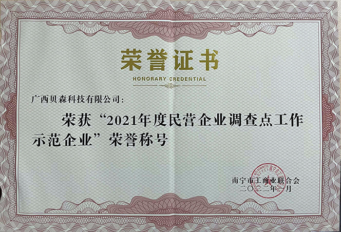 廣西貝森科技有限公司榮獲南寧市工商業(yè)聯(lián)合會授予的“2021年度民營企業(yè)調(diào)查點工作示范企業(yè)”榮譽稱號
