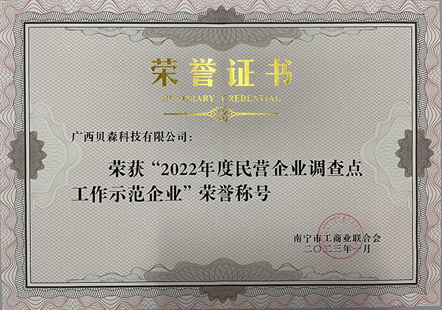 廣西貝森科技有限公司榮獲南寧市工商業(yè)聯(lián)合會(huì)授予的“2022年度民營(yíng)企業(yè)調(diào)查點(diǎn)工作示范企業(yè)”榮譽(yù)稱(chēng)號(hào)