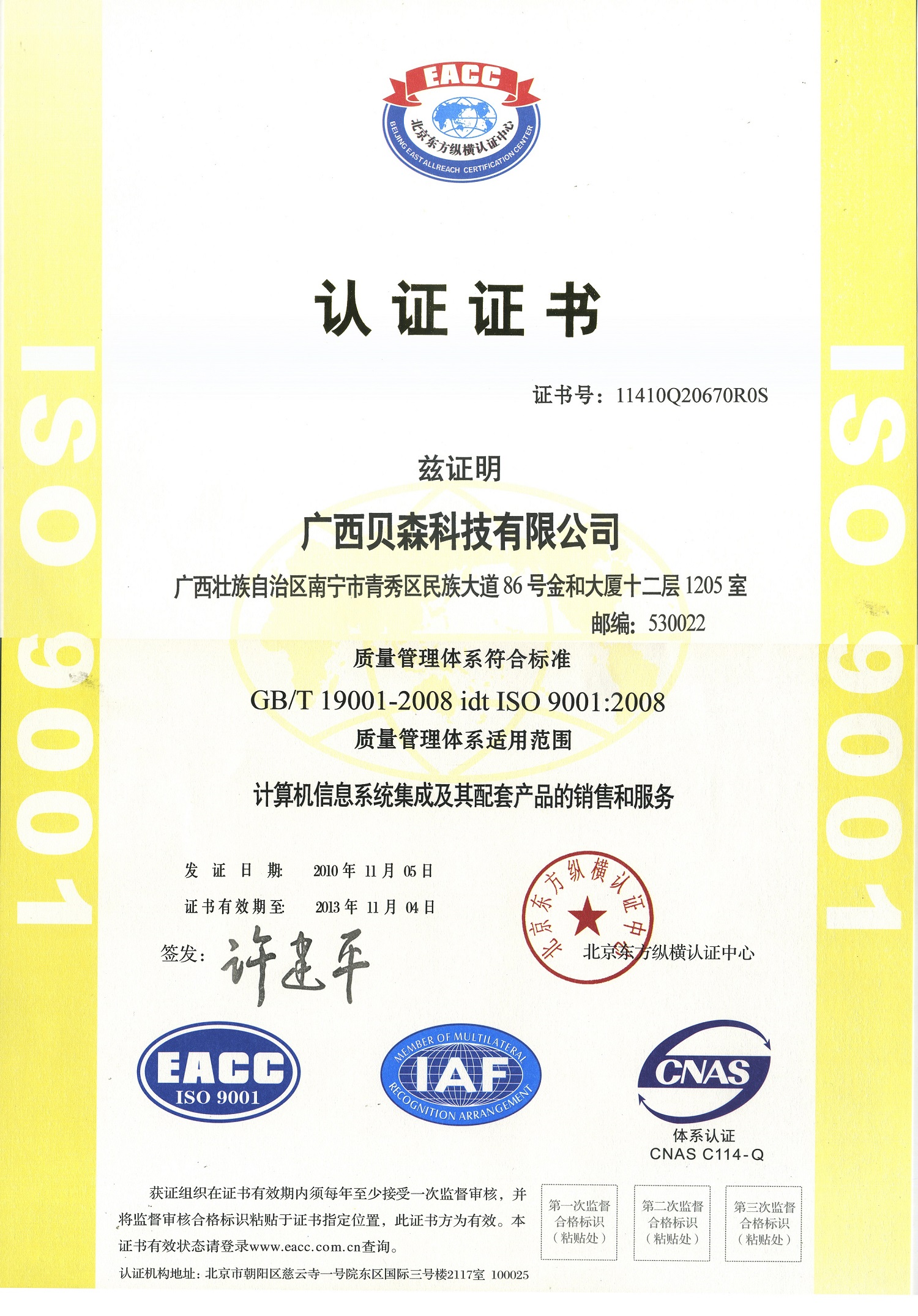 廣西貝森科技有限公司獲得ISO9001:2008質(zhì)量管理體系認(rèn)證證書