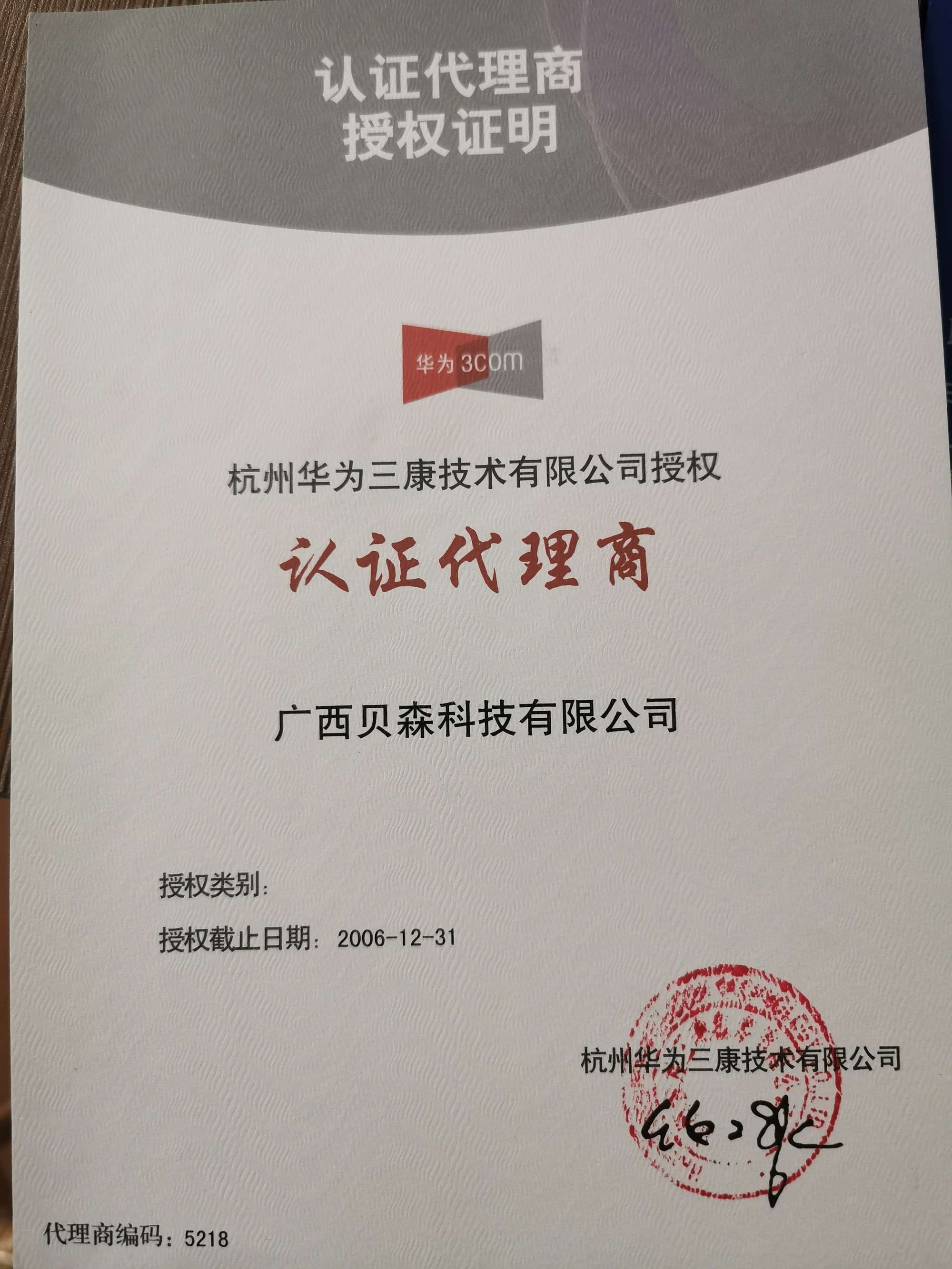 廣西貝森科技有限公司獲得H3C認證代理證書