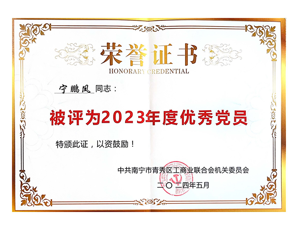 熱烈祝賀寧鵬鳳同志榮獲中共南寧市青秀區(qū)工商業(yè)聯(lián)合會(huì)機(jī)關(guān)委員會(huì)授予的“2023年度優(yōu)秀黨員”稱號(hào)