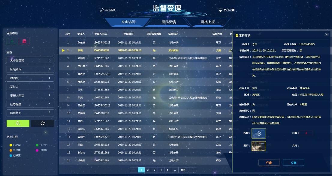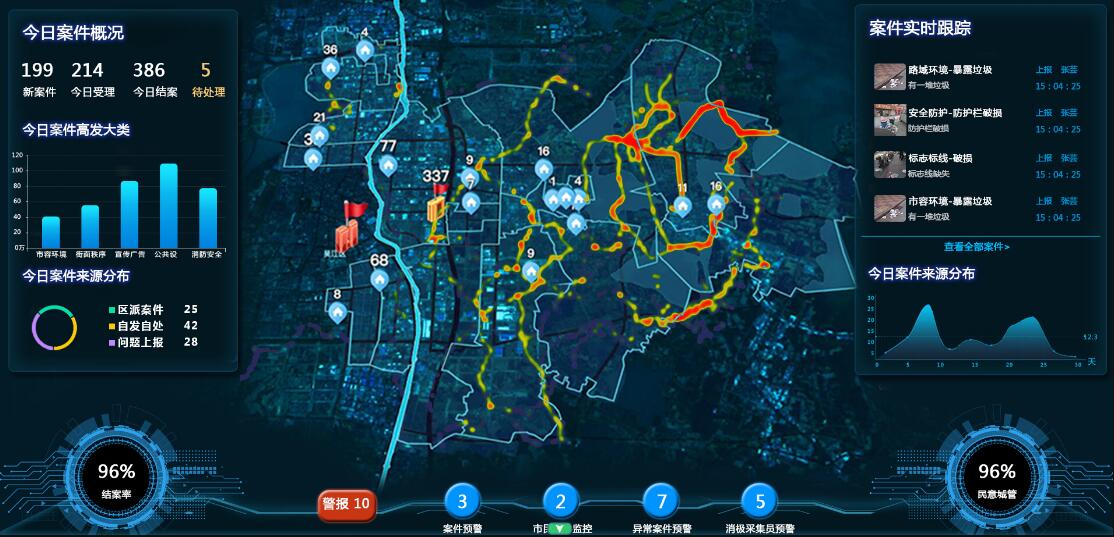 案卷滾動(dòng)信息區(qū)能夠?qū)崟r(shí)統(tǒng)計(jì)反映全市、區(qū)(縣)所有網(wǎng)格在辦案卷數(shù);滾動(dòng)顯示正在辦理的每個(gè)案卷基本信息;詳細(xì)信息區(qū)是指到單個(gè)問題、網(wǎng)格的詳細(xì)信息,包括城管信息員位置、案卷辦理情況、綜合評價(jià)結(jié)果等。